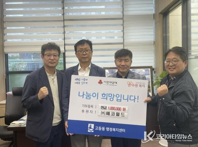 코리아타임뉴스 사회팀 | 수원시 팔달구 고등동은 10월 13일, 사회적기업 ㈜에코월드로부터 관내 취약계층을 위한 이웃돕기 성금 100만원을 전달받았다고 밝혔다.
