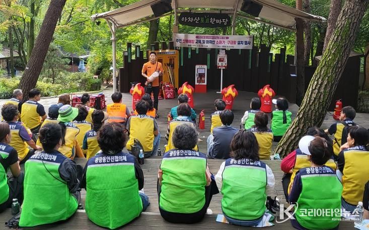 코리아타임뉴스 오영주 기자 | 광진구는 지난 9월 25일 아차산 토요한마당과 등산로 일대에서 지역주민 80여 명이 참석한 가운데 등산로 안전시설 설치 및 산불 예방 교육 행사를 실시했다.