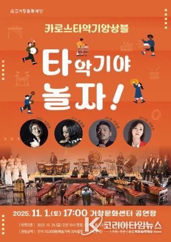 코리아타임뉴스 경남취재본부 | (재)거창문화재단은 오는 11월 1일 토요일 오후 5시 거창문화센터 공연장에서 카로스 타악기 앙상블과 함께하는'타악기야 놀자!'를 개최한다.