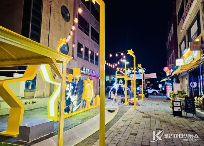 코리아타임뉴스 노승선 기자 | 문경시는 점촌원도심상권 130m 구간에 노란색 간판과 어닝을 새로 달고, 상징 조형물 13점, 조형벤치 20개를 설치했으며, 은하수 조명 18m와 360여 개의 파티등으로 ‘닻별 테마길’을 화려하게 완공했다.