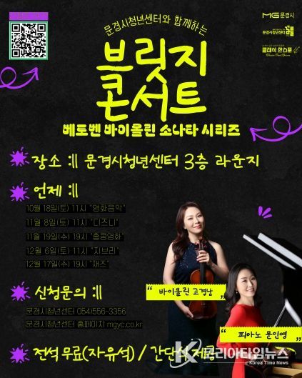 코리아타임뉴스 노승선 기자 | 문경시청년센터는 오는 10월부터 12월까지 문경시청년센터 3층 라운지에서 클래식을 주제로 한‘브릿지 콘서트’를 연다.