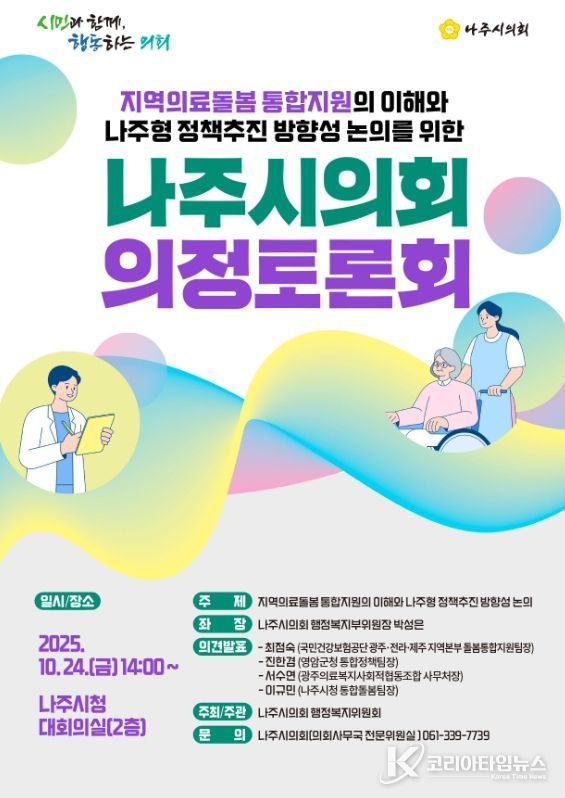토론회는 박성은 나주시의회 행정복지위원회 부위원장이 좌장을 맡아 진행되며, 최점숙 국민건강보험공단 광주·전라·제주지역본부 돌봄통합지원팀장, 진한겸 전라남도 영암군청 통합정책팀장, 서수연 광주의료복지사회적협동조합 사무처장, 이규민 나주시청 통합돌봄 팀장의 의견발표로 진행될 예정이다.