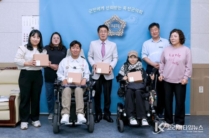 코리아타임뉴스 박찬식 기자 | 옥천군의회는 지난 14일 의장 집무실에서 충북형 최중증장애인 권리중심일자리 사업 참여자들이 직접 제작한 굿즈를 전달받는 자리를 가졌다.