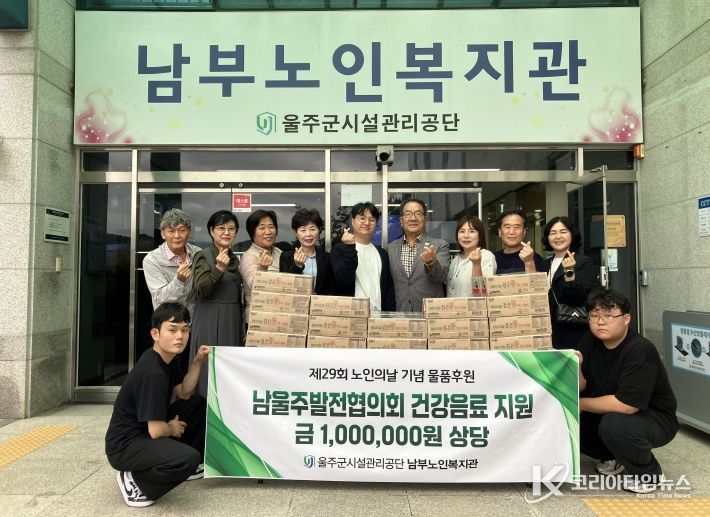 코리아타임뉴스 울산취재본부 | 울주군시설관리공단 남부노인복지관(관장 조덕행)은 10월 14일 남울주발전협의회(회장 한성율)로부터 100만원 상당의 건강음료 1,000개를 기부받았다.