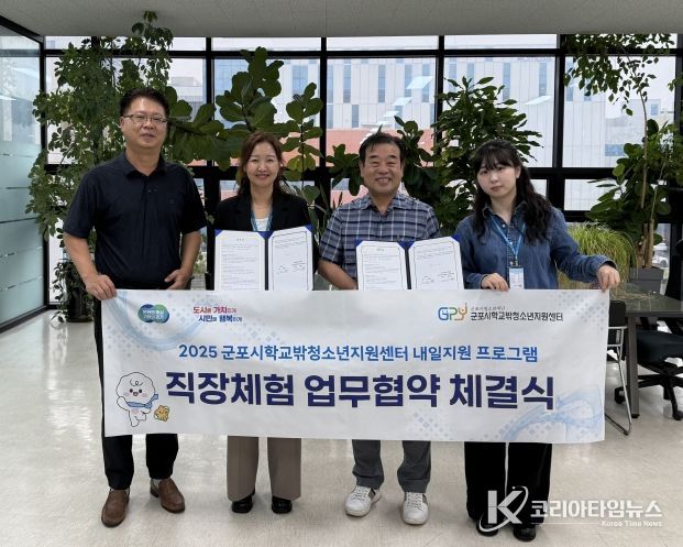 코리아타임뉴스 사회팀 | 군포시청소년재단(대표이사 김덕희), 군포시학교밖청소년지원센터(센터장 강연미)는 시각디자인 분야로의 진학과 진로를 희망하는 학교 밖 청소년을 지원하기 위해 관내 디자인 전문업체인 ㈜은진과 직장체험 업무협약을 체결했다고 밝혔다.