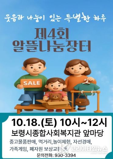 코리아타임뉴스 충남취재본부 | 보령시종합사회복지관은 오는 10월 18일 오전 10시부터 12시까지 복지관 앞마당에서 ‘제4회 알뜰나눔장터’를 개최한다.