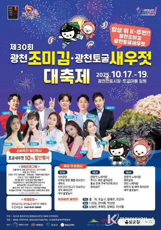 코리아타임뉴스 충남취재본부 | 홍성군 광천읍은 오는 17일부터 19일까지 3일간 광천전통시장 및 토굴마을 일원에서 ‘제30회 광천조미김·광천토굴새우젓 대축제’의 성대한 막을 올릴 예정이라고 밝혔다.