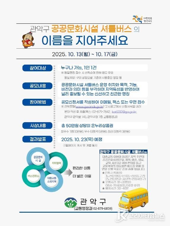 코리아타임뉴스 기동취재팀 | 관악구가 오는 12월부터 대중교통 사각지대에 ‘공공문화시설 셔틀버스’를 시범 운영하며 교통약자의 이동 편의와 공공문화시설 접근성 제고에 나선다.