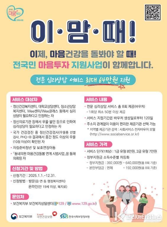 ‘마음투자 지원사업’ 신청은 거주지 동주민센터를 방문하거나 복지로 누리집(홈페이지)을 통해 온라인으로도 가능하다. 나이와 소득에 관계없이 누구나 이용 가능하며, 자세한 사항은 구 보건소 건강증진과로 문의하면 된다.