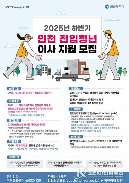 코리아타임뉴스 윤경수 기자 | 인천광역시는 인천으로 전입하는 청년들의 주거비 부담을 완화하고 지역사회에 안정적으로 정착할 수 있도록, 상반기에 이어 하반기에도 최대 40만 원의 이사비를 지원한다고 밝혔다.