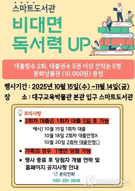 ‘비대면 독서력UP’은 10월 15일부터 11월 14일까지 대구교육박물관(북구 대동로1길 40) 본관 입구에 위치한 스마트도서관 기기에서 총 2회, 5권의 도서 대출 서비스를 이용하는 이용자 선착순 5명에게 모바일 문화상품권(10,000원)을 증정하는 행사다.
