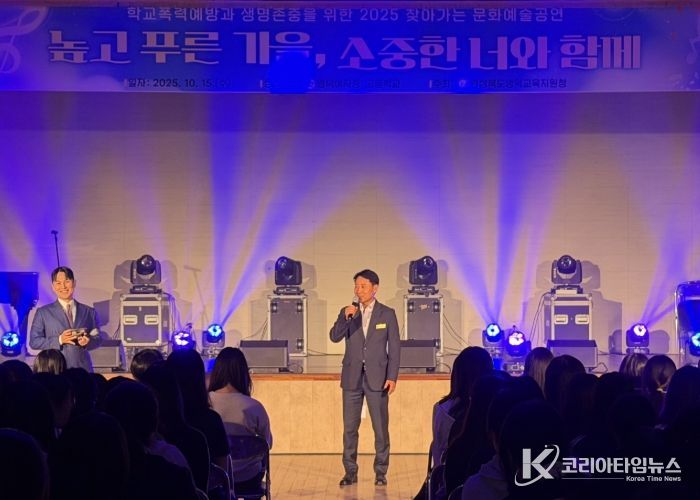 코리아타임뉴스 사회팀 | 영덕교육지원청은 10월 14일부터 16일까지 관내 초, 중, 고등학교 5교에서 학생들과 교직원을 대상으로 2025 찾아가는 문화예술공연 ‘높고 푸른 가을, 소중한 너와 함께’를 성황리에 운영했다.