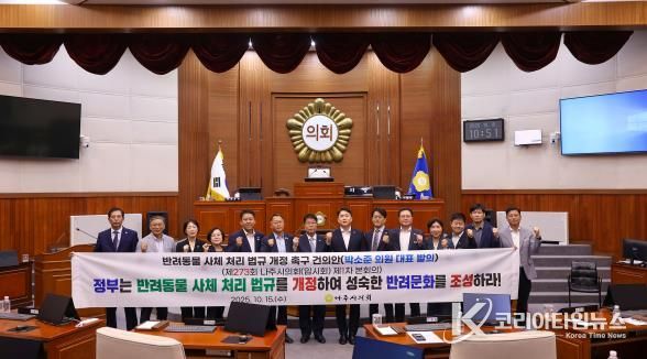 코리아타임뉴스 노승선 기자 | 나주시의회는 15일 제273회 임시회 제1차 본회의를 열고 ‘반려동물 사체 처리 법규 개정 촉구 건의안’을 채택했다.