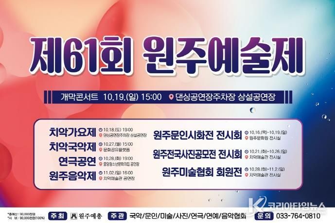 코리아타임뉴스 노승선 기자 | (사)원주예총은 오는 10월 16일부터 11월 2일까지 원주시 댄싱공연장 주차장 상설공연장과 치악예술관 전시실 등 원주 전역에서 시민과 함께하는 ‘제61회 원주예술제’를 개최한다.