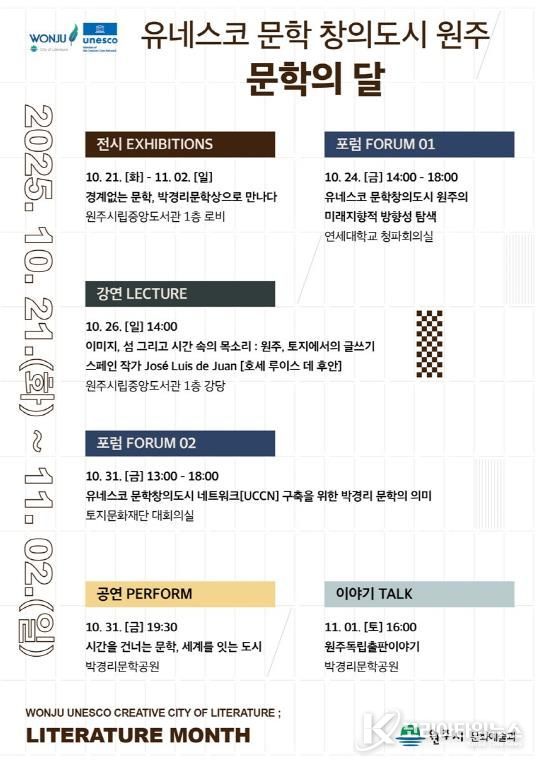 코리아타임뉴스 노승선 기자 | ‘유네스코 문학 창의도시 원주’가 오는 10월 21일부터 11월 2일까지 ‘시간을 건너는 문학, 세계를 잇는 도시’를 기치로'2025년 원주 문학의 달'행사를 개최한다.