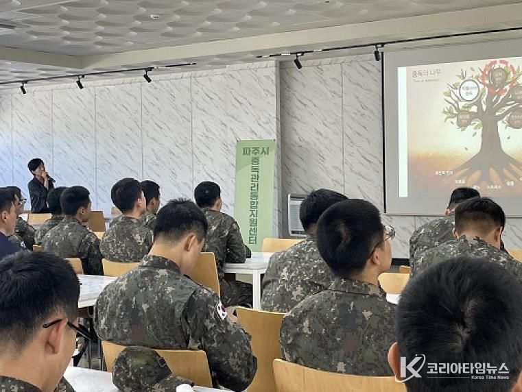 코리아타임뉴스 윤광희 기자 | 파주시중독관리통합지원센터가 건강한 군 생활과 지역사회의 안전을 위해, 관내 군부대를 대상으로 4대중독(알코올, 인터넷, 마약, 도박) 예방 교육을 운영하고 있는 가운데 10월 13일부터 15일까지 2기갑여단 600여 명을 대상으로 도박 중독 예방교육을 실시했다고 밝혔다.