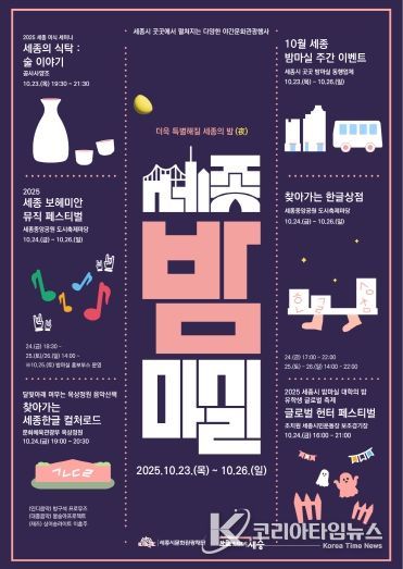 코리아타임뉴스 오영주 기자 | (재)세종시문화관광재단(대표 박영국)이 오는 10월 23일부터 26일까지 4일간, 시민과 관광객을 대상으로 깊어가는 가을 정취를 온몸으로 느낄 수 있는 ‘10월 세종 밤마실 주간’을 개최한다.