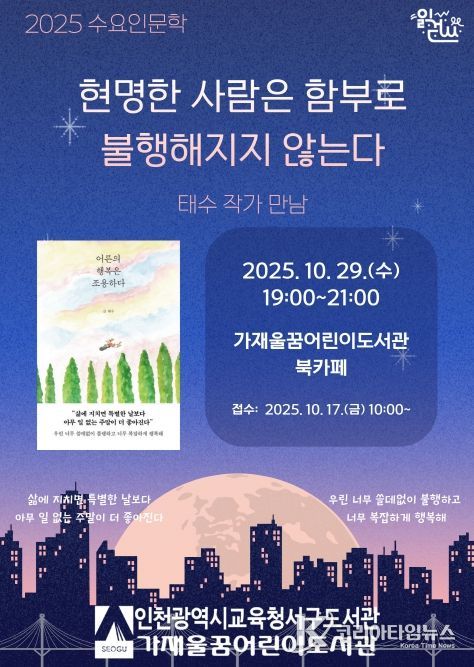 코리아타임뉴스 사회팀 | 인천광역시교육청서구도서관은 10월 29일 오후 7시부터 9시까지 『어른의 행복은 조용하다』의 저자 태수 작가를 초청해 ‘수요인문학’ 강연 ‘현명한 사람은 함부로 불행해지지 않는다’를 진행한다.