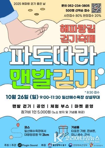 코리아타임뉴스 김택호 기자 | 울산 동구가 오는 10월 26일 오전 9시부터 11시 30분까지 일산해수욕장 상설무대 일원에서 ‘2025 해파랑길 걷기 축제 – 파도 따라 맨발 걷기’를 개최한다.