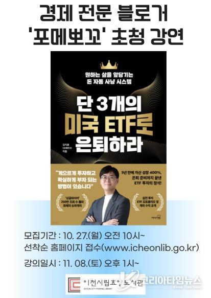 코리아타임뉴스 문화팀 | 이천시 효양도서관은 시민들의 경제적 이해력 향상과 현명한 자산 관리 능력 제고를 위해 오는 11월 8일 오후 1시, '단 3개의 미국 ETF로 은퇴하라'의 저자이자 네이버 경제 전문 블로거 김지훈(필명 포메뽀꼬)을 초청해 재테크 특강을 진행한다.