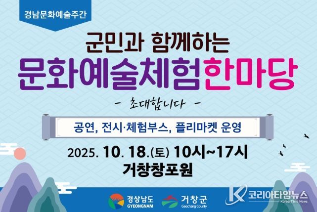 코리아타임뉴스 오영주 기자 | 거창군은 오는 18일 거창의 대표 관광지인 거창창포원 일원에서 ‘2025 문화예술체험한마당’을 성대하게 개최한다.