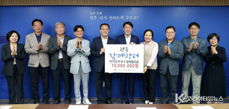 바이전주우수업체협의회(회장 전상문)는 16일 전주시장실을 방문해 ‘전주함께장터’ 기부금 1000만 원을 전달했다.