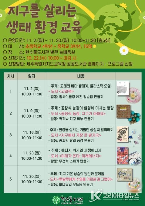 코리아타임뉴스 사회팀 | 제주도교육청 한수풀도서관은 그림책 속 생태·환경 이야기를 통해 어린이와 청소년이 생활 속 환경보호의 중요성을 이해하고 자연에 대한 감수성을 기를 수 있는 ‘2025년 지구를 살리는 생태·환경 교육’ 참가자를 모집한다.