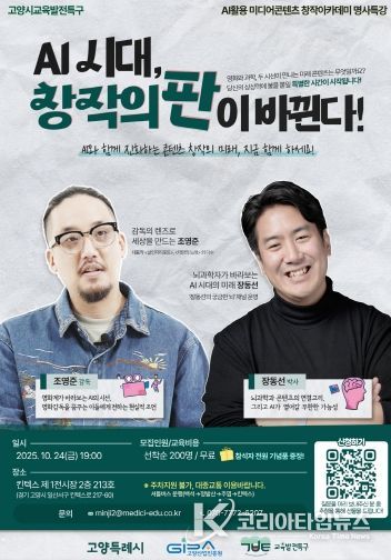 코리아타임뉴스 기동취재팀 | 고양산업진흥원은 오는 24일 오후 7시, 킨텍스 제1전시장 213호에서 명사특강 ‘AI시대, 창작의 판이 바뀐다!’를 개최한다.