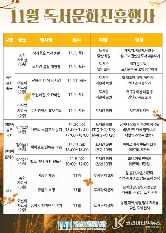 코리아타임뉴스 오영주 기자 | 사천시는 사천시립도서관에서 11월 한 달 동안 책과 함께 여유로운 시간을 보내며 감성을 채울 수 있는 다양한 독서문화행사와 체험 프로그램을 운영한다고 17일 밝혔다.