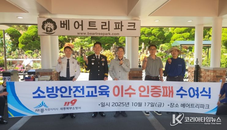 코리아타임뉴스 김태훈 기자 | 세종북부소방서가 17일 전동면에 위치한 베어트리파크를 ‘소방안전교육 우수 인증공원’으로 선정하고 인증패를 수여했다.