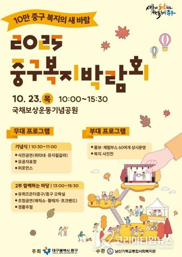 코리아타임뉴스 대구취재본부 | 대구 중구는 오는 10월 23일 중구 국채보상운동기념공원에서 2025 중구 복지박람회를 개최한다고 밝혔다.