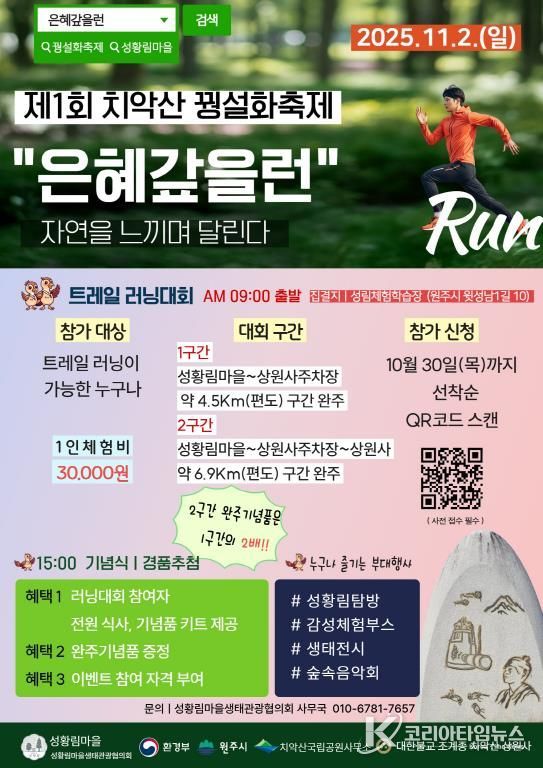 코리아타임뉴스 노승선 기자 | 환경과 생태, 그리고 지역 고유의 설화를 함께 즐길 수 있는 제1회 치악산 꿩설화 축제 ‘은혜갚을런’이 오는 11월 2일 원주시 신림면 성림체험학습장 일원에서 개최된다.