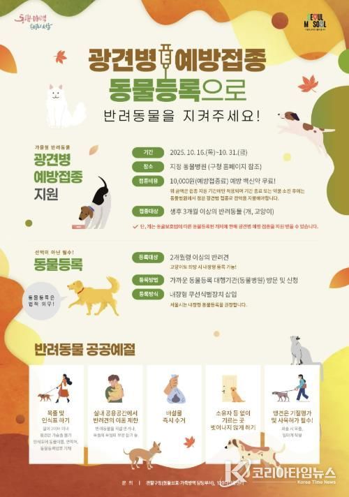 코리아타임뉴스 노승선 기자 | 마포구는 10월 31일까지 광견병 발생 및 확산을 예방하기 위해 관내 40곳 동물병원에서 ‘2025년 가을철 광견병 예방접종’을 실시한다.