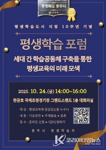 코리아타임뉴스 박찬식 기자 | 충주시가 평생학습도시 지정 10주년을 맞아 평생학습 포럼을 24일 오후 2시, 탄금호국제조정경기장 그랜드스탠드 대회의실에서 개최한다.