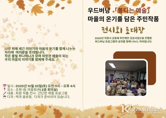 코리아타임뉴스 기동취재팀 | 의왕시는 마을공동체 자강불식이 오는 10월 25일 초평1동마을회관(윗새우대북길 14)에서'우드버닝, 불타는 예술'작품전시회를 개최한다고 밝혔다.