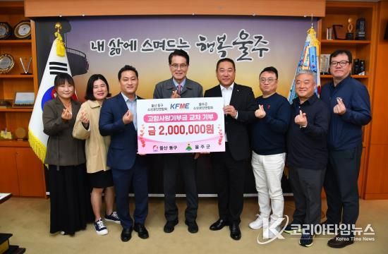 코리아타임뉴스 노승선 기자 | 울주군 소상공인연합회와 울산 동구 소상공인연합회가 21일 고향사랑기부제 활성화와 지역 상생 발전을 위해 상호 지자체에 200만원씩 교차 기부를 실시했다.