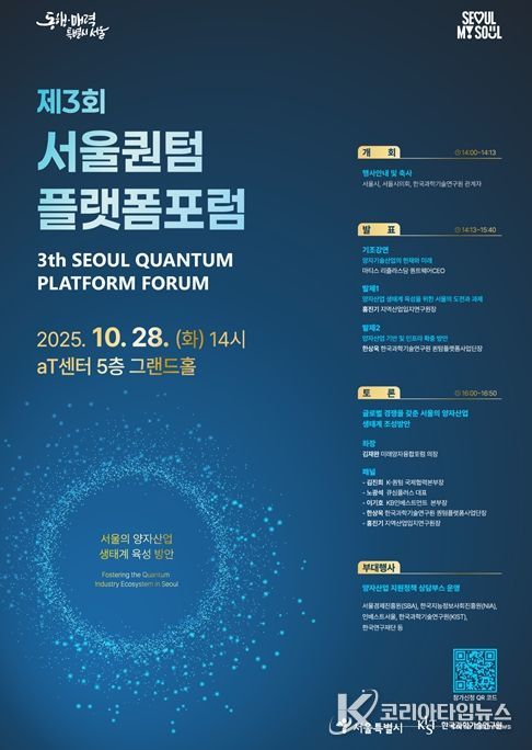 서울시는 한국과학기술연구원(KIST)과 함께 10월 28일 오후 2시, 양재 aT센터 5층 그랜드홀에서 ‘제3회 서울퀀텀플랫폼 포럼(3th Seoul Quantum Platform Forum)’을 개최한다고 밝혔다.