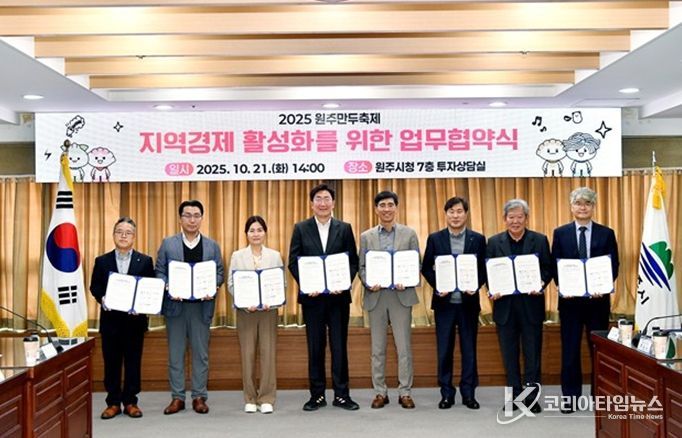 코리아타임뉴스 김택호 기자 | 원주시는 오는 24일부터 26일까지 열리는 ‘2025 원주만두축제’의 성공적 개최와 지역 상권 활성화를 위해, 21일 시청에서 ‘지역경제 활성화를 위한 업무협약’을 체결했다.