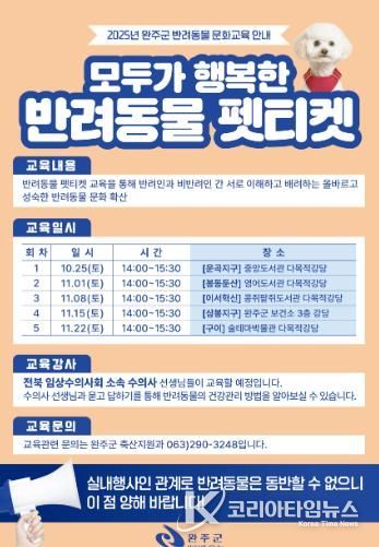 코리아타임뉴스 전북취재본부 | 완주군이 성숙한 반려문화 정착과 동물복지 향상을 위해 ‘모두가 행복한 반려동물 펫티켓’ 문화교육을 실시한다.