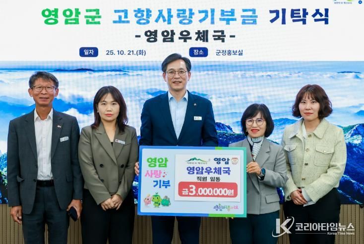 코리아타임뉴스 노승선 기자 | 영암우체국 직원들이 21일 영암군을 찾아 고향사랑기부금 300만원을 전달했다.