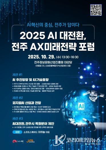 전주시와 (재)전주정보문화산업진흥원(원장 허전, 이하 진흥원)은 오는 29일 진흥원 대강당에서 ‘AI혁신의 중심, 전주가 답이다’를 주제로 한 전주AX미래전략 포럼을 개최한다.