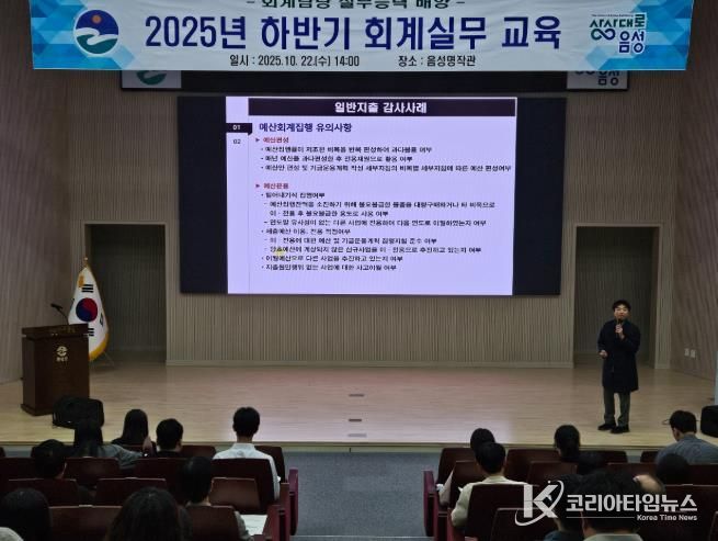 코리아타임뉴스 충북취재본부 | 음성군은 22일 음성명작관에서 회계 담당 군 공직자 130여 명을 대상으로 ‘2025년 하반기 회계실무 교육’을 실시했다.