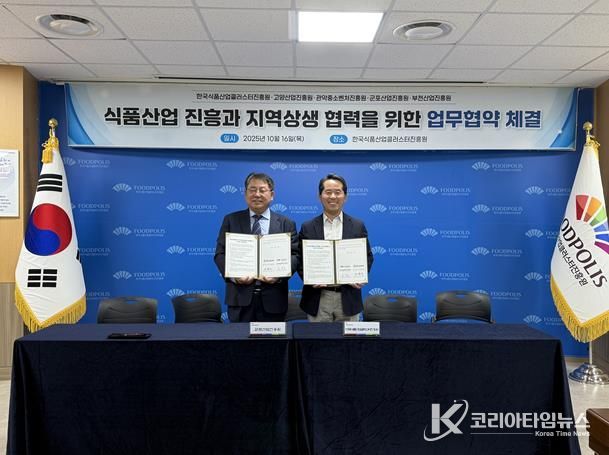 코리아타임뉴스 사회팀 | 군포산업진흥원은 10월 16일 한국식품산업클러스터진흥원과 군포시 식품산업 발전과 식품 제조·가공 기업 육성과 경쟁력 강화를 위한 업무협약(MOU)을 체결했다고 밝혔다.