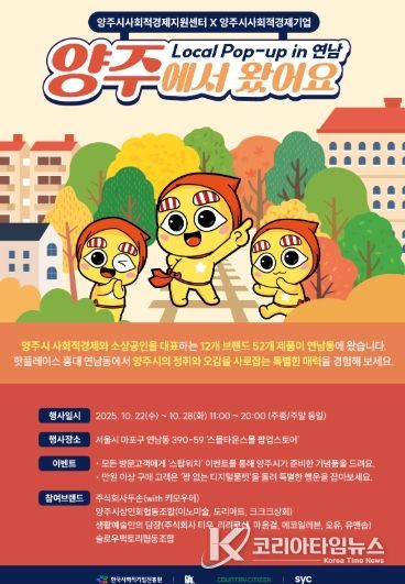 ‘양주에서 왔어요(Local Pop-up in 연남)’는 10월 22일 28일 오전 11시부터 오후 8시까지(주중·주말 동일) 운영되며, 방문객을 위한 ‘스탬프 이벤트’와 ‘양주시 디지털 룰렛 경품 행사’ 등 다양한 체험 이벤트도 함께 진행한다.
