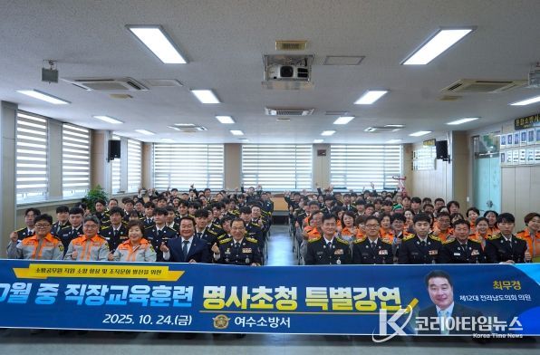코리아타임뉴스 김태훈 기자 | 여수소방서(서장 서승호)는 10월 24일 본서에서 전 직원 및 의용소방대원을 대상으로 청렴·소통 강화 및 전기차 화재대응 특별교육, 명사 초청 공직자 교육을 실시했다.
