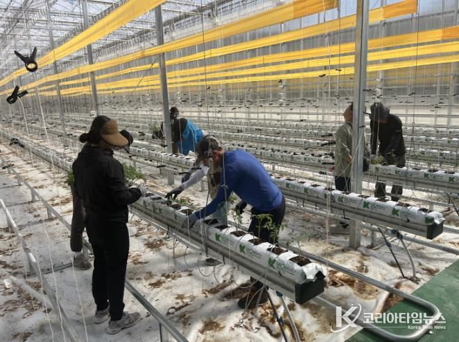 코리아타임뉴스 경북취재본부 | 봉화군은 지난 24일 봉성면 금봉리에 위치한 청년 창업농 경영실습임대농장 스마트농업 온실에 토마토를 정식했다.