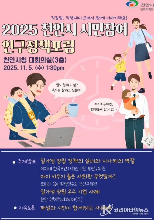 코리아타임뉴스 김택호 기자 | 천안시는 다음 달 5일 시청 대회의실에서 ‘2025 천안시 시민참여 인구정책포럼’을 개최한다.