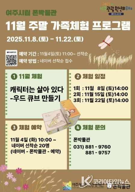 코리아타임뉴스 기동취재팀 | 여주세종문화관광재단은 여주시립 폰박물관에서 2025년 11월 8일부터 11월 22일까지 매주 토요일 오후 2시, 온 가족이 함께 즐길 수 있는 ‘11월 주말 가족 체험 프로그램’을 운영한다고 밝혔다.