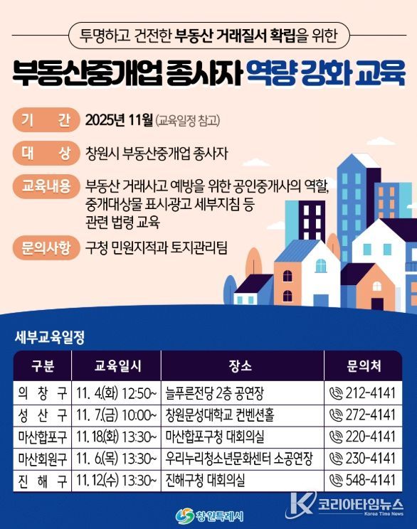 코리아타임뉴스 오영주 기자 | 창원특례시는 건전하고 안전한 부동산 거래 환경 조성을 위해 부동산중개업 종사자를 대상으로 ‘부동산 거래사고 예방 및 역량 강화 교육’을 실시한다고 29일 밝혔다.