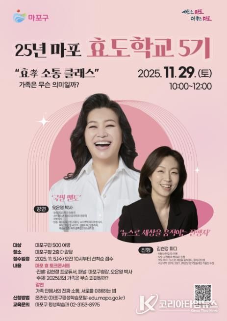‘마포 효도학교 5기’로 진행되는 ‘효(孝) 소통 클래스’는 가족의 의미를 재조명하고 세대 간 마음을 잇는 따뜻한 소통의 장으로, 11월 29일 오전 10시 마포구청 대강당에서 열린다.
